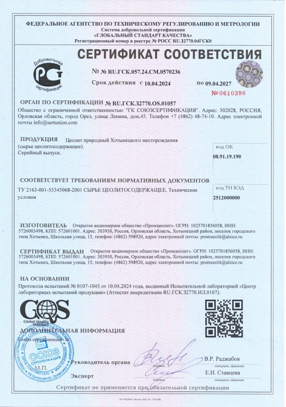 Продукция ОАО «Промцеолит» является основой для различных видов продуктов, таких как: мелиоранты, почвоулучшители для сельского хозяйства, грунты для садоводства, добавки в корма животных и птиц, наполнители для туалетов домашних животных и добавки в строительные смеси и цемент.